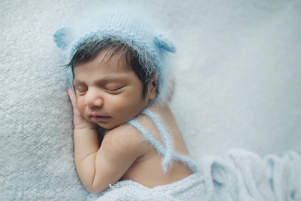 baby newborn blue boy bear hat photography